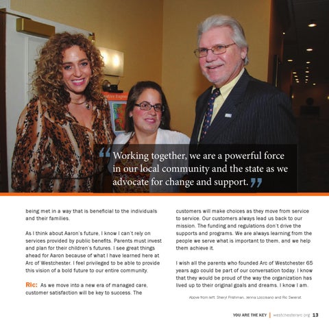 customers will make choices as they move from service to service. Our customers always lead us back to our mission. The funding and regulations don’t drive the supports and programs. We are always learning from the people we serve what is important to them, and we help them achieve it. I wish all the parents who founded Arc of Westchester 65 years ago could be part of our conversation today. I know that they would be proud of the way the organization has lived up to their original goals and dreams. I know I am. Above from left: Sheryl Frishman, Jenna Loccisano and Ric Swierat