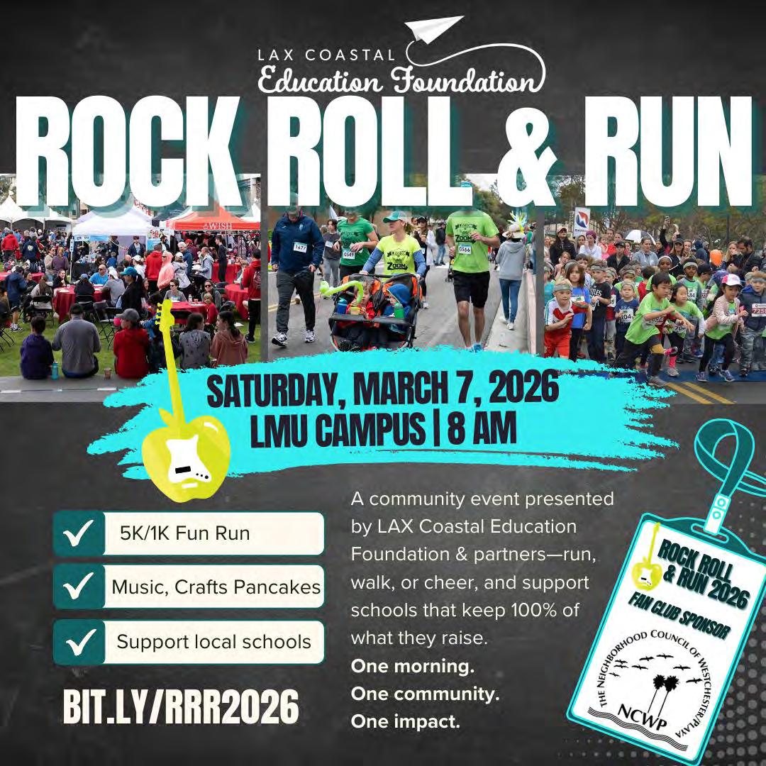 The LAX Coastal Education Foundation is planning its sixth annual Rock Roll & Run for Education in partnership with LMU. Participants can sign up for the 5K or Kids’ 1K Fun Run, and select one of 20+ local schools they’d like to support! At the Saturday, March 7th event, attendees can enjoy the run/walk, and stick around the campus for a Community Expo featuring a pancake breakfast, live music, giveaways and family-friendly activities. For more information and to register, visit bit.ly/RRR2026. Sponsor booths are also available.