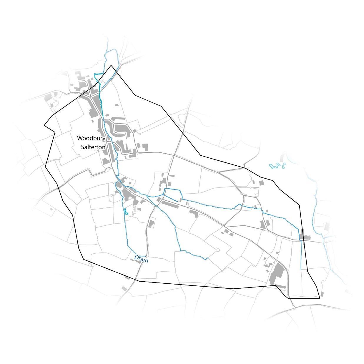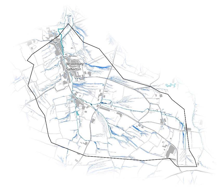 The watercourse is channelised through Woodbury Salterton, although the extent of historic flooding wasn’t determined at the time of survey.