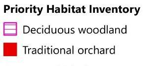 There are two traditional orchards in the area, the larger of the two is to the west of Woodbury Salterton and the other is in the east of the catchment. There is a patch of broadleaved, deciduous woodland priority habitat in the catchment’s centre where Village Road, Whitecross Road, and Toby Lane meet. There is also a patch of mixed mainly broadleaved woodland in the southeast of the catchment.