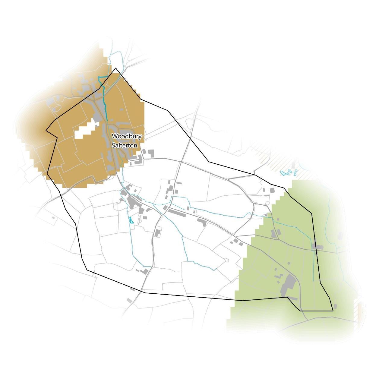 The Woodbury Salterton micro-catchment for the Grindle Brook flowing into the River Clyst is 145ha and highlights 29 properties potentially at riskfrom surface water flooding, many of these are in Woodbury Salterton. There are multiple possible contributing causes of this, including the topography, land use, and scarcity of habitats such as woodland. The catchment is failing Water Framework Directive (WFD) regulations on chemical status and is within a Drinking Water Safeguard Zone at riskof contamination by pesticides.