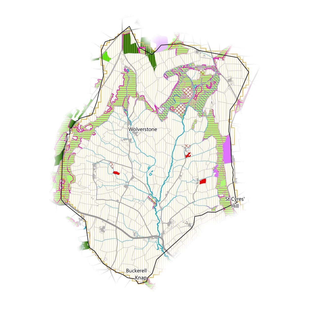 The micro catchment covers the rural area to the north west of Awliscombe and includes several small settlements, including Wolverstone. The A373 runs along the south of the catchment connecting it with Honiton to the East. The micro catchment forms the watershed for the River Wolf that flows southwards through the catchment with several tributary’s feeding in from the east and west. Overall, the micro catchment falls within the Awliscombe County Parish and is administered by Awliscombe Parish Council.