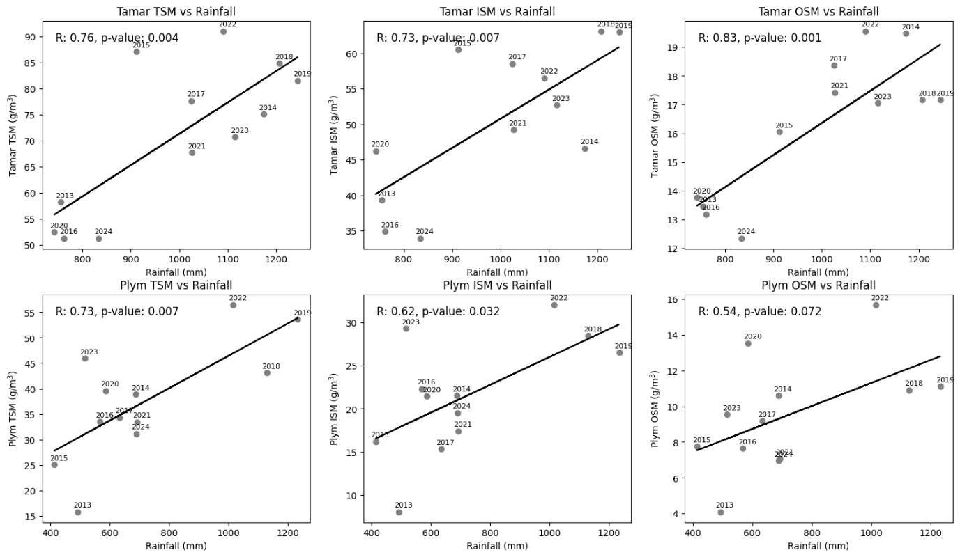 High correlation between rainfall and TSM, ISM, and OSM (g/m3) from both the Plym and Tamar on an annual basis.