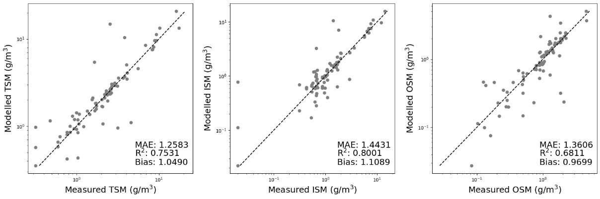 Robust model performance for TSM, ISM and OSM, with a low bias and accuracy of between 20 and ~40% between measured and modelled concentrations.