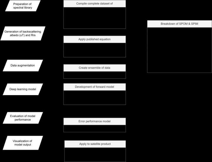 • It generates a spectral library using the forward biooptical model (turning N=66 in situ data to 17,301,504 synthetic spectral data).