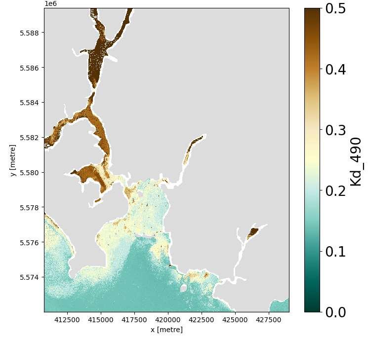 Kd(490). Winter 2023, high rainfall. Summer 2024, low rainfall. Significantly reduced light visibility in the lower Tamar River and Plymouth Sound during prolonged periods of heavy rainfall.