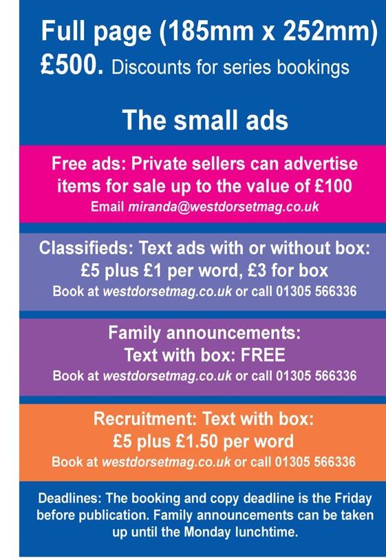 Why not sponsor a section? A strap this size doesn’t cost the earth. Email advertising@westdorsetmag.co.uk for details and to book.