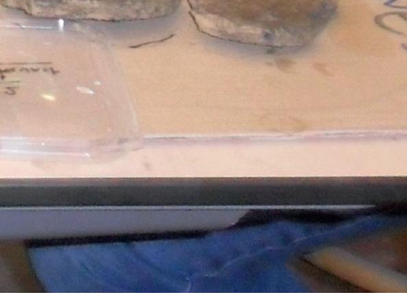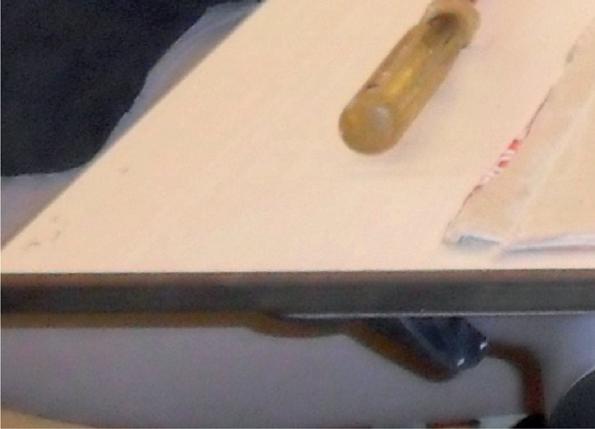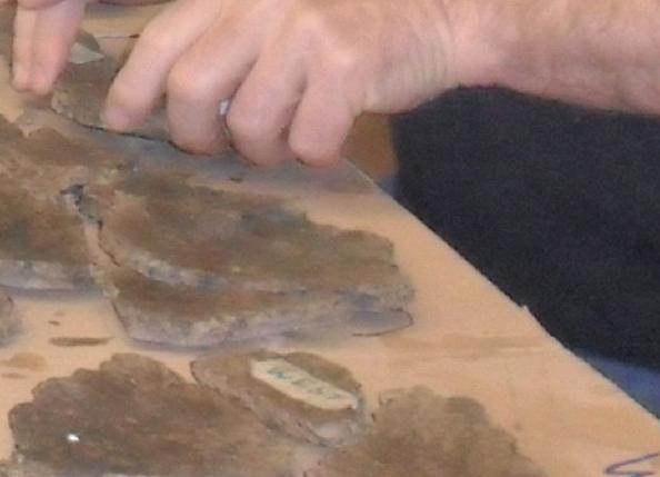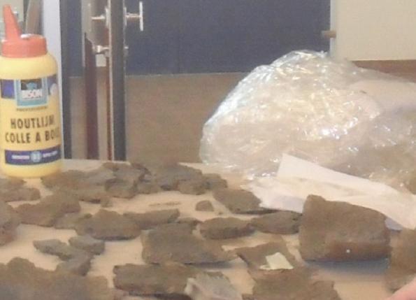 Wat volgde was een lange periode van zorgvuldig puzzelen: minutieus passen en meten, daarna verlijmen. Stap voor stap vorderde ook dit deel van het project, evenals de afwerking: het opvullen van naden en van ont brekende delen en de rand met een speciale pasta, die bestond uit een mix van grond uit de pot en houtlijm.