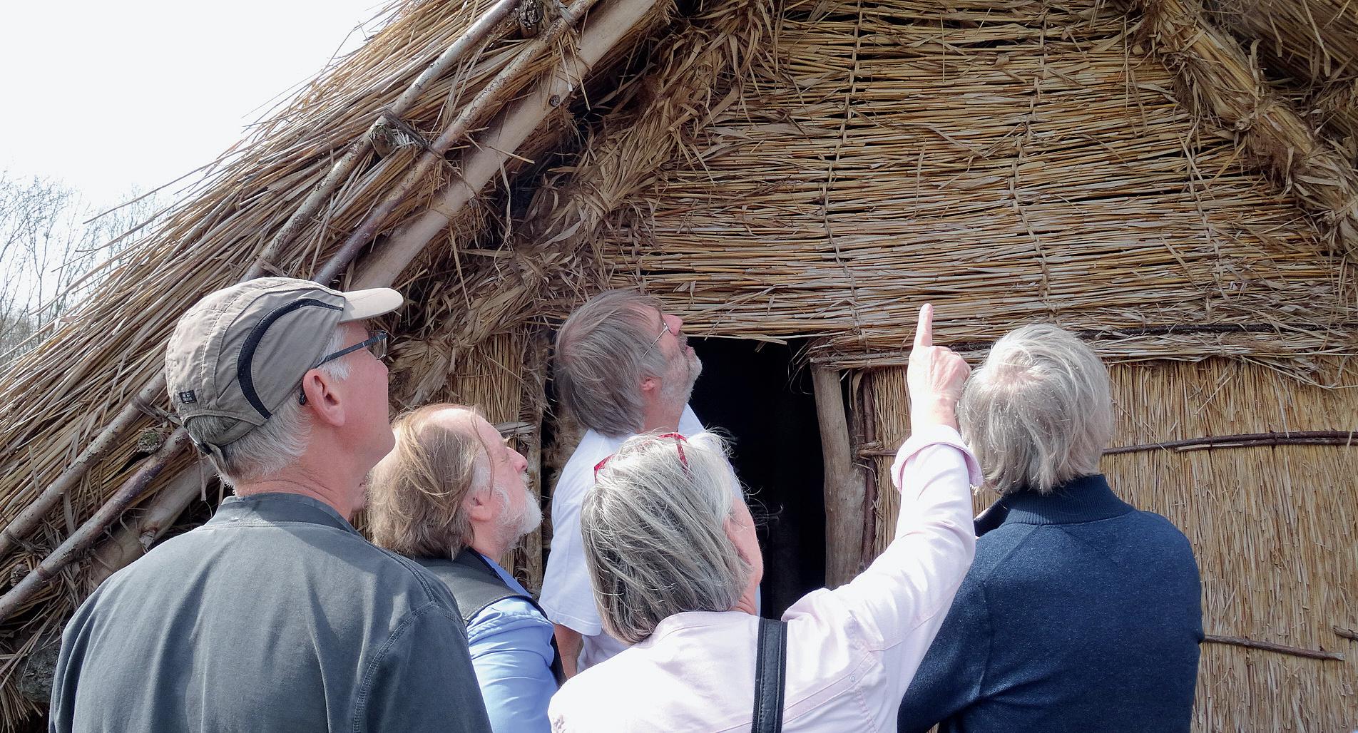 Na een uitstekende en geanimeerde lunch volgde het middagprogramma, waarvoor verschillende locaties op de planning stonden. De eerste locatie was het Educatief Archeologisch Erf, gelegen in de Broekpolder. Jeroen ter Brugge en Jurrien Moree (beiden Helinium) toonden de leden wat er al gerealiseerd was op het Erf, waaronder een met oorspronkelijke werktuigen gemaakte kopie van een boomstamkano uit de ijzertijd. De reconstructie is gemaakt naar het voorbeeld van een kano die in de buurt is opgegraven. Ook het op de oorspronkelijke manier nagebouwde prehistorische huis genoot veel belangstelling.