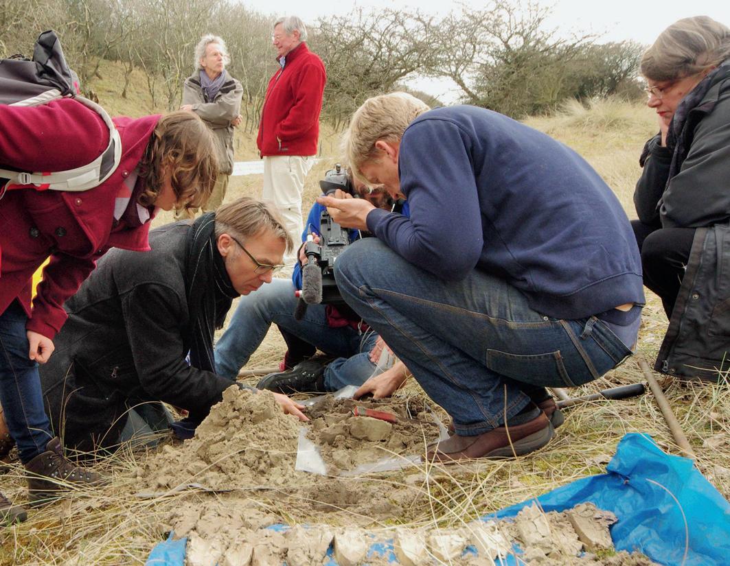 Grote belangstelling bij boringen naar een vermoedelijke Romeinse laag in duinreservaat Meijendel tijdens een ZHAAPexcursie naar Leidschendam-Voorburg.