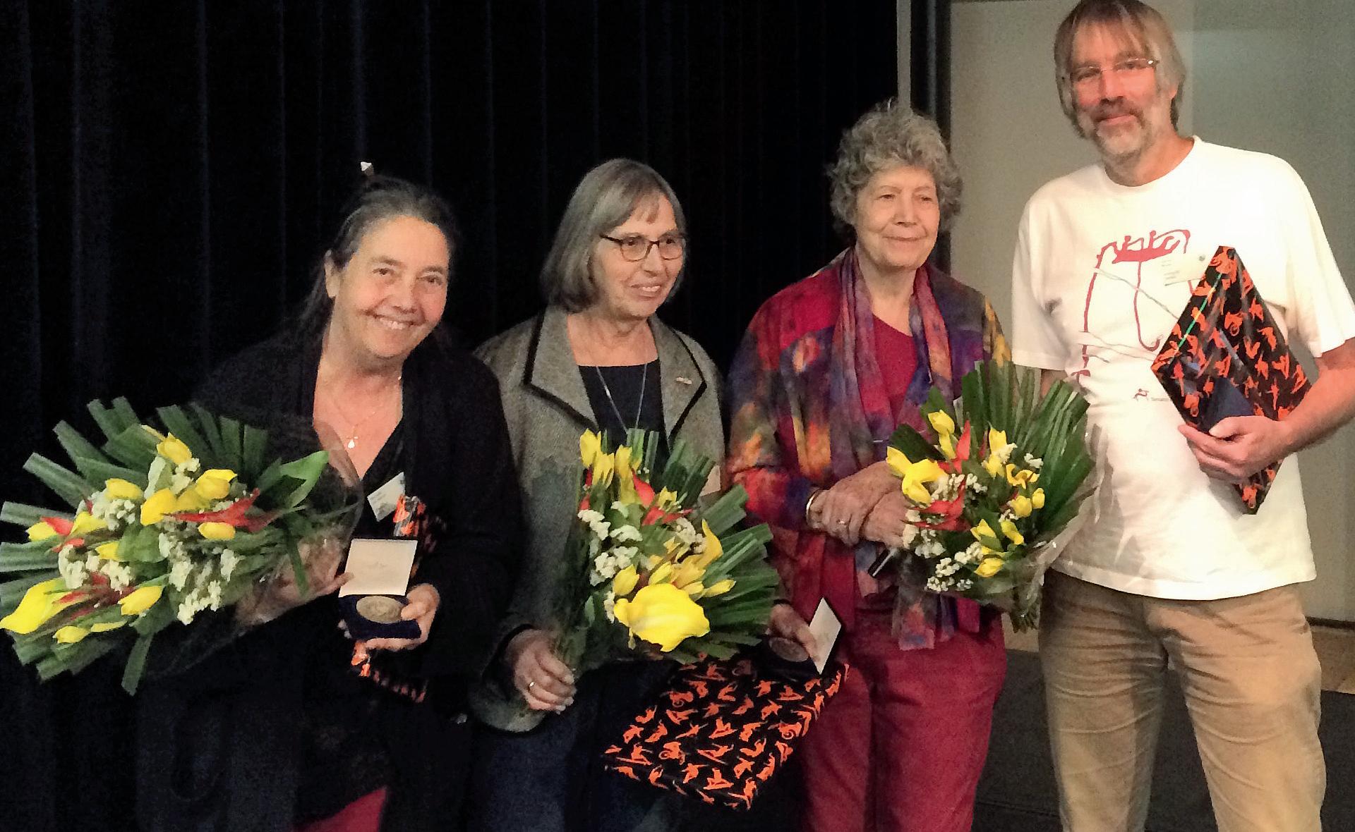 Trotse AWN’ers met hun legpenningen. Van links naar rechts: Hanneke van Alphen-Verkuijlen, Dicky de Koning, oudvoorzitter Tonnie van de Rijdt en Jurrien Moree.