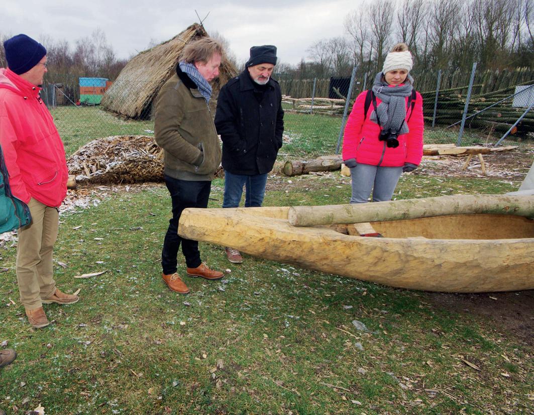 Excursie naar Vlaardingen. Tim de Ridder (tweede van links) geeft uitleg bij de replica van de kano uit de Romeinse Tijd van het Educatief Archeologisch Erf in de Broekpolder.