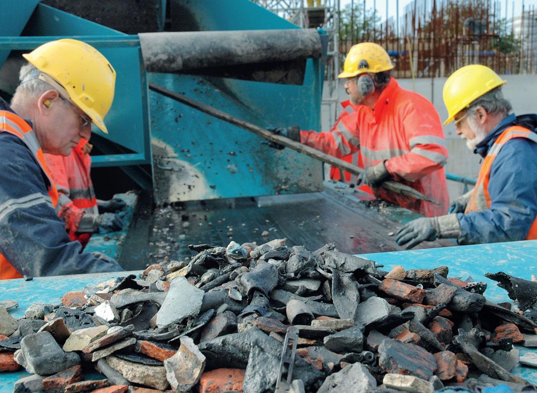Vrijwilligers ‘oogsten’ vondsten uit het materiaal dat naar boven komt.
