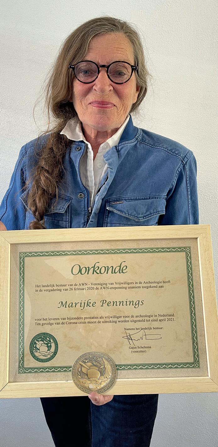 ‘Ik ben helemaal verbouwereerd, beduusd’, zei Marijke Pennings, toen ze uit handen van landelijk voorzitter Gajus Scheltema de AWNerepenning in ontvangst mocht nemen. Een bevlogen en toegewijde vrijwilligster noemde Gajus haar in zijn toespraak. Marijke is vanaf 1992 betrokken bij de archeologie, eerst bij de Archeologische Vereniging Limburg en, sinds 1997, als actief lid van AWN-afdeling 16 Nijmegen e.o. Marijke heeft aan talloze opgravingen meegewerkt, zoals die van het Valkhof (De Bastei) in Nijmegen. Waar erfgoed bedreigd werd liet Marijke zich gelden: mede dankzij haar werden grafheuvels in de Hatertse en Overasseltse Vennen beschermd. Als voorzitter van AWN Nijmegen wist ze veel waardevolle verbindingen tussen de professionals en de vrijwilligers van de AWN-afdeling te leggen, nog altijd tot groot wederzijds voordeel.