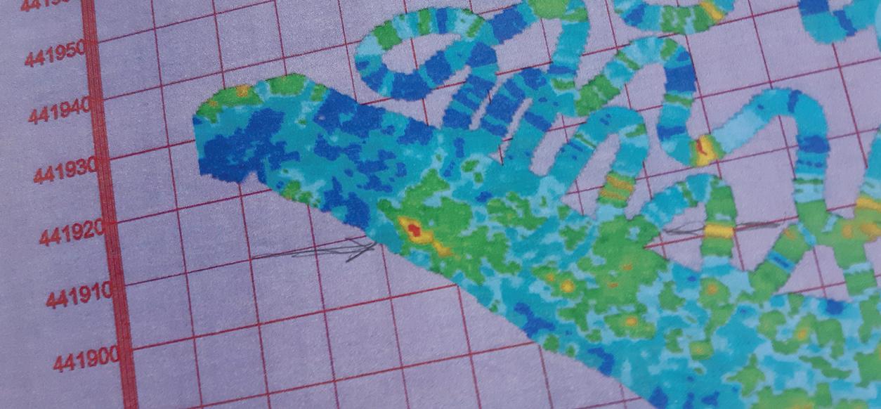 Op het noordelijk gelegen gedeelte van het terrein van de oude steenfabriek Roodvoet konden we, met behulp van met een drone gemaakte foto’s, een oude rivierloop traceren. Deze loop hebben we verder gevolgd met boringen en bemonsteringen. Het vergelijken van de provinciale zanddieptekaart van Gelderland met onze boorresultaten kan inzicht geven in de ouderdom van rivierlopen: hoe dichter een restgeul bij nul meter boven N.A.P. (of eronder) ligt, des te groter de kans dat hij een hogere ouderdom kent. Een bemonstering van een restgeul moet hierover uitsluitsel kunnen geven.