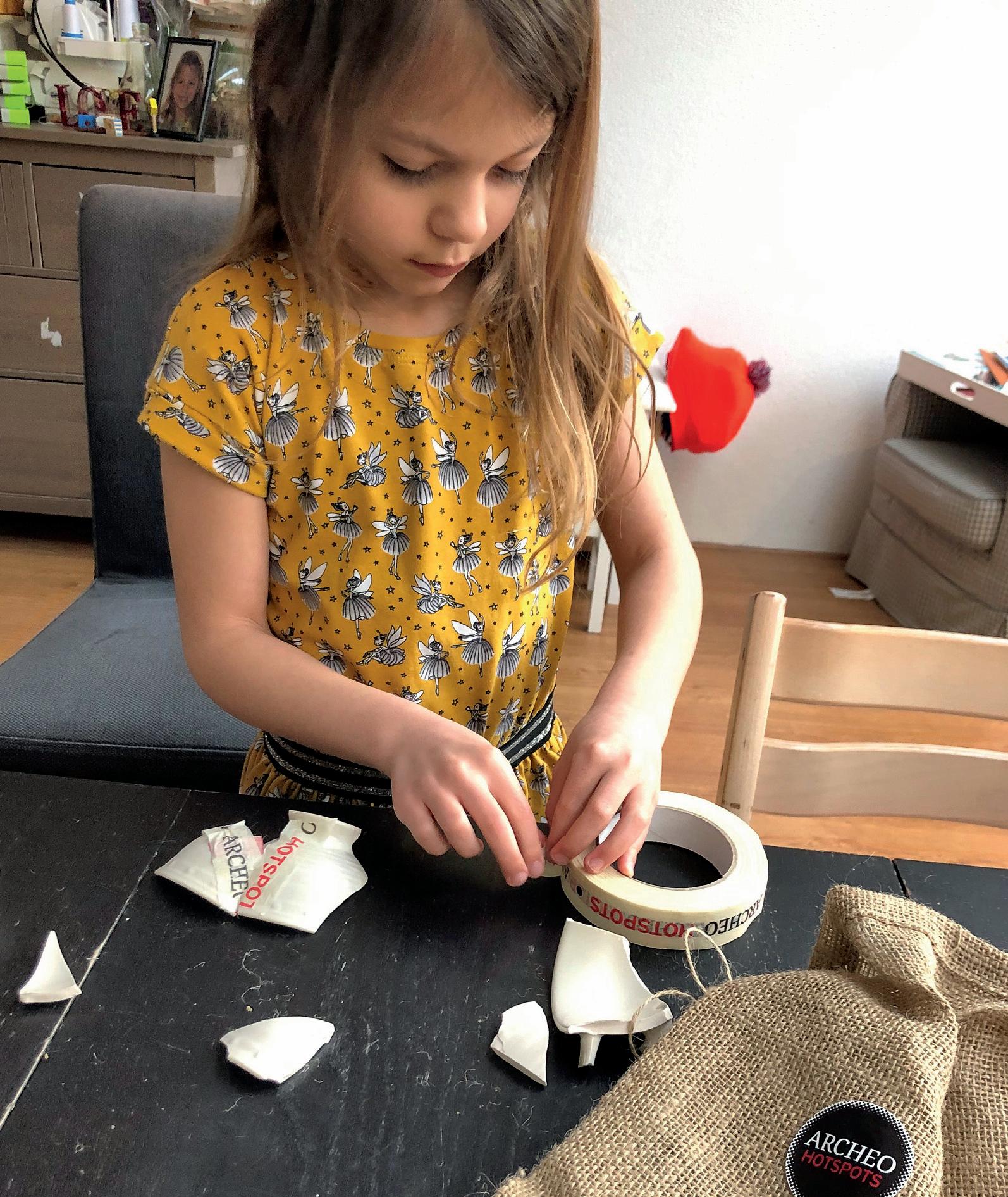 Op één van de dagen waren de kinderen van 4 tot 8 aan de beurt om ArcheoHotspotkids te zijn. De kinderen hadden bij het afhalen van het hele pakket een geheimzinnig zakje ontvangen met het logo van de ArcheoHotspot. Dat spannende zakje mocht eindelijk open worden gemaakt! In het zakje zaten een berg scherven, tape om de scherven mee aan elkaar te plakken, een kleurplaat van een prehistorisch potje en een diploma. Eerst mochten ze een door de ArcheoHotspot Ede opgenomen filmpje op YouTube bekijken over wat archeologie precies is, met een inkijkje in Edese opgravingen, wat er bij opgravingen gevonden wordt en hoe je nu eigenlijk een potje in elkaar moest plakken.