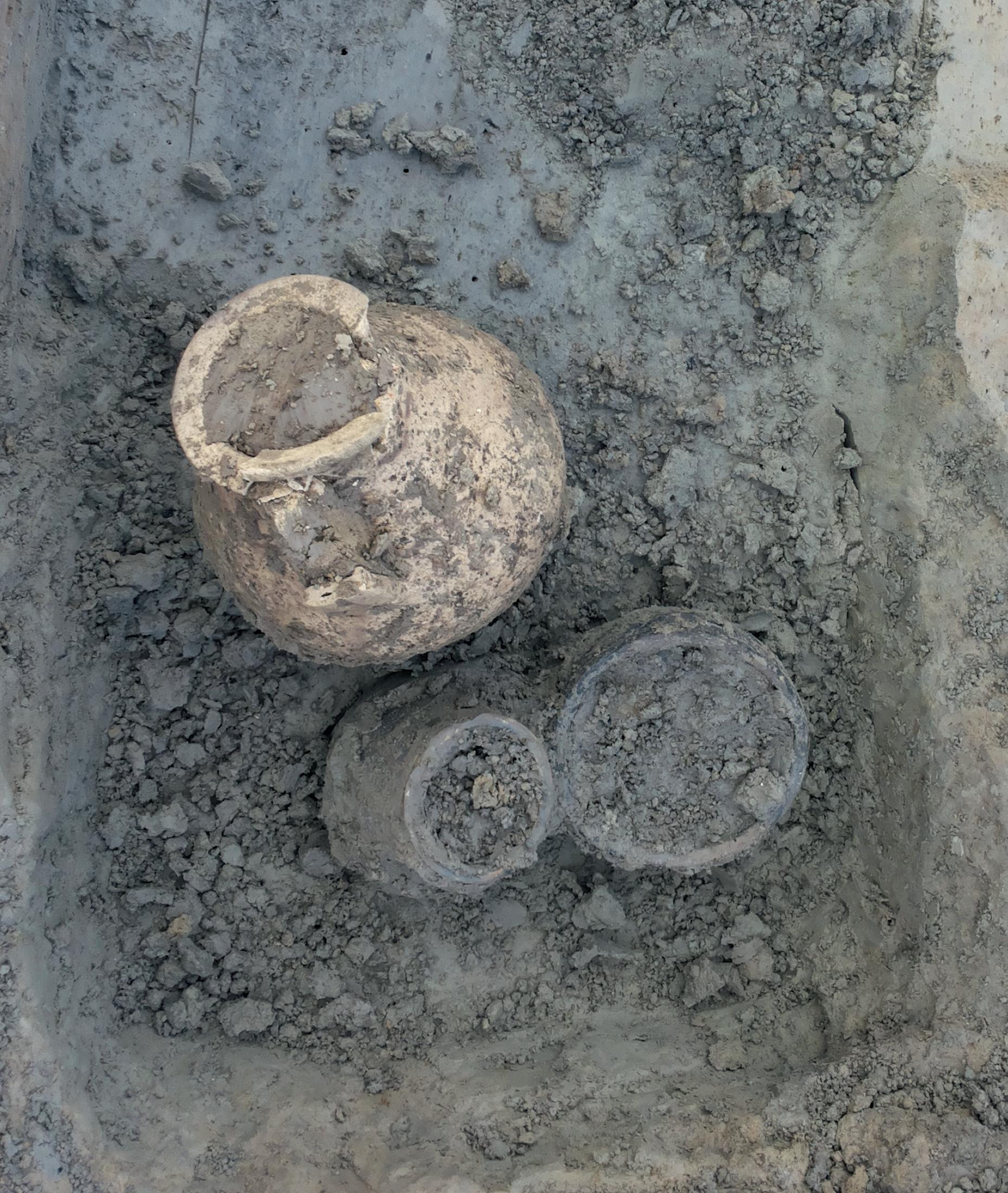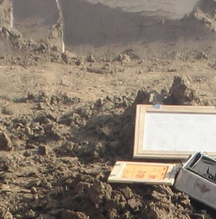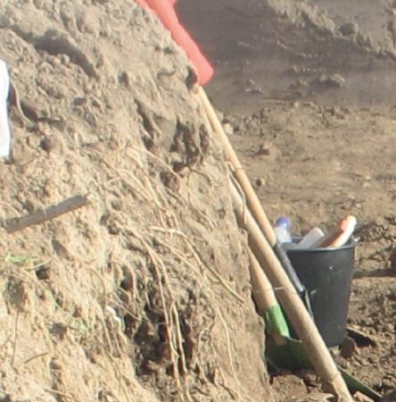 Een groep aardewerk afkomstig uit de beerput. Het waterpassen in de beerput.