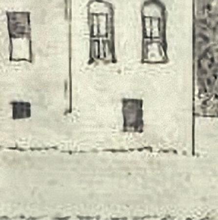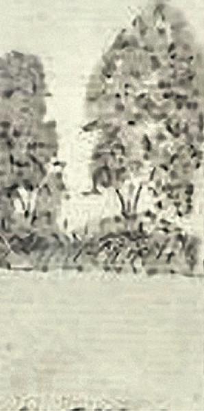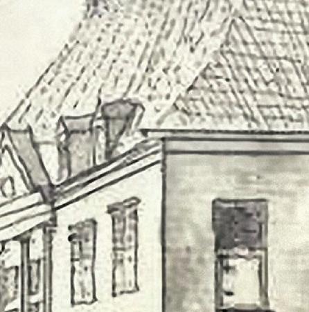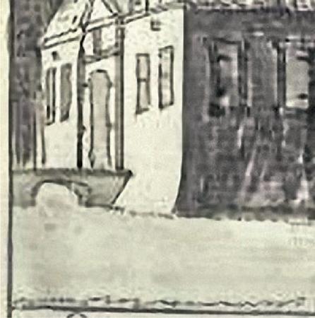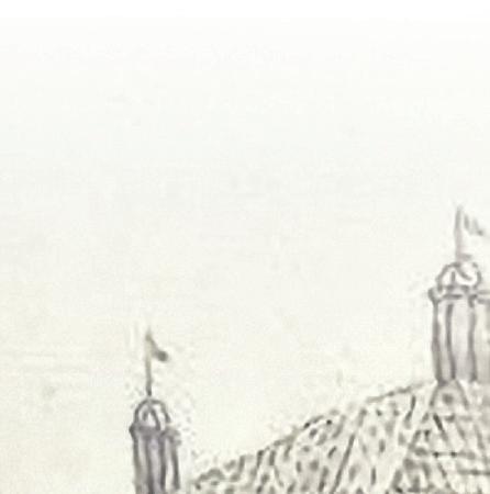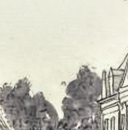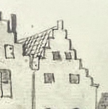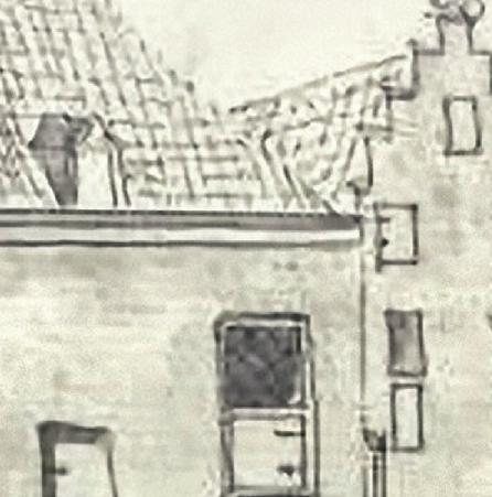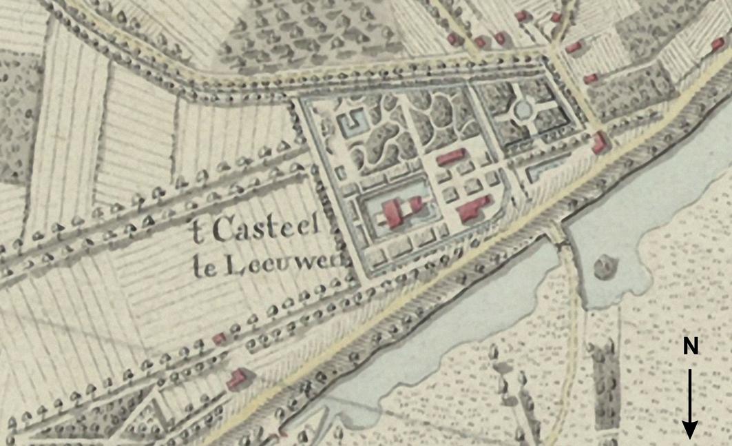 Tekening van ’t Huys te Leeuwen door Andries Schoemaker rond 1732. Het nu nog bestaande poorthuis is aan de linkerzijde te zien.