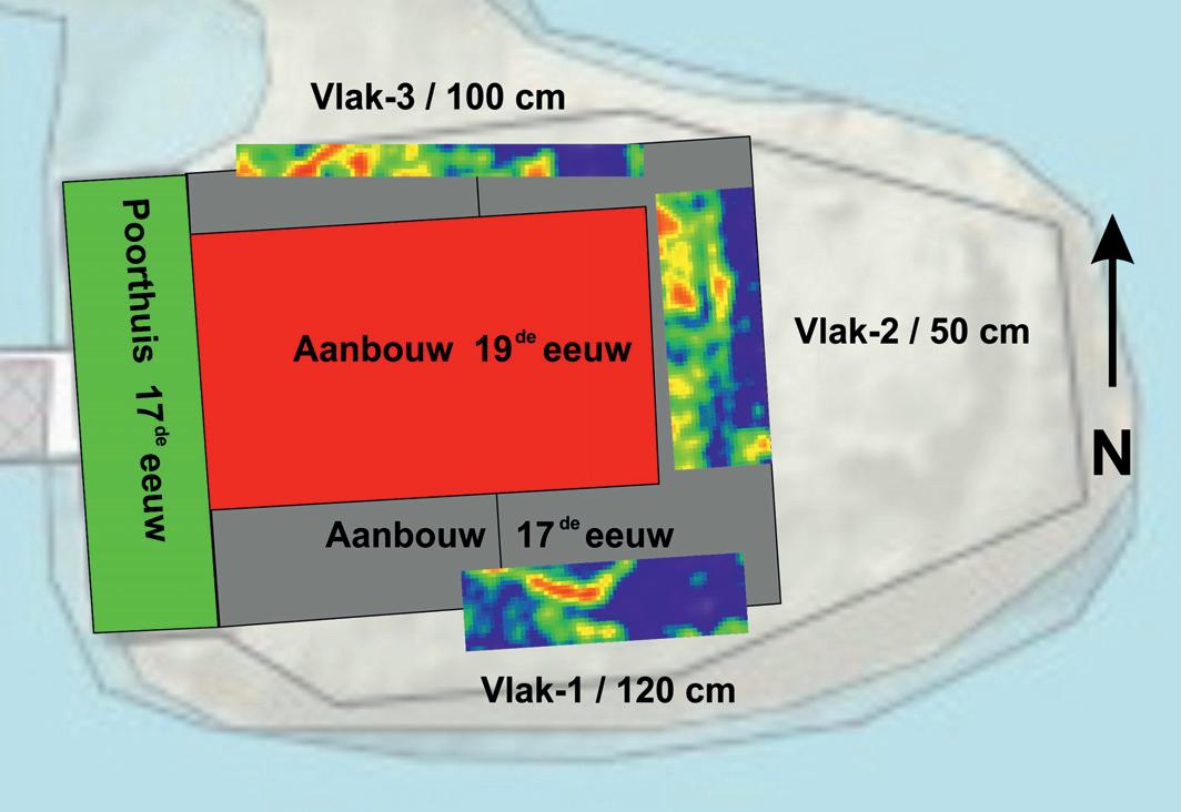 De eveneens heldere reflecties van Vlak-3 zouden wel kunnen passen bij een muurfundering van de zeventiende-eeuwse aanbouwen. Om hierover een beter gefundeerde uitspraak te kunnen doen had het meetvlak eigenlijk wat breder moeten zijn, maar dat liet de beschikbare ruimte op het terrein helaas niet toe.