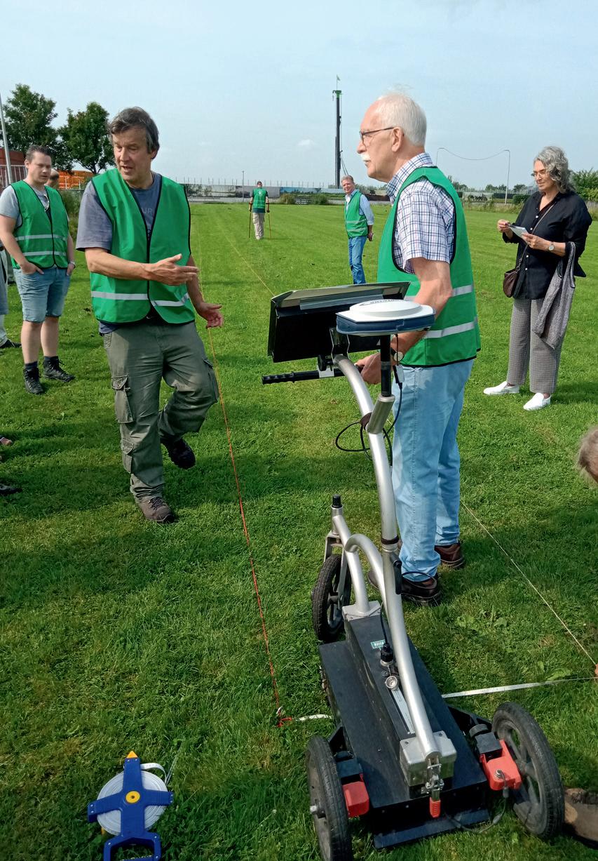 3 Het tweede zogeheten Electromagnetische Inductie-onderzoek vond plaats op 25 mei 2021 op het strand. Het derde geofysische onderzoek met grondradar was gericht op het vinden van het limeswegtracé tussen het castellum van Valkenburg en de Uitwatering. Dit onderzoek werd op 21 augustus 2021 uitgevoerd door de begin 2019 door Peter Seinen, Ruud Hemelaar (beiden AVKP) en mij opgerichte landelijke Werkgroep In-