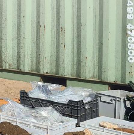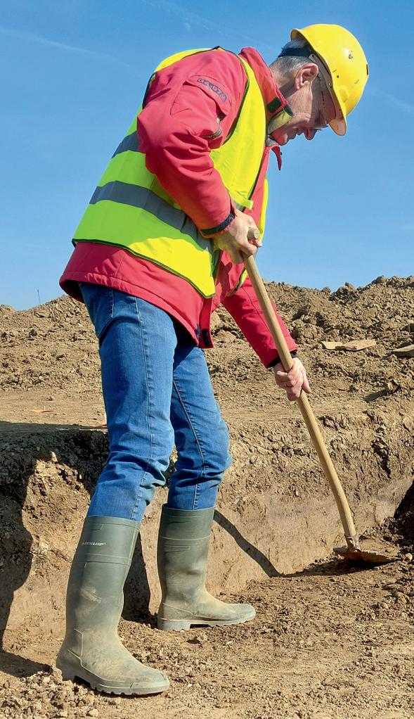 de Bijland te onderzoeken. Centraal staat daarbij de Romeinse weg naar het castellum Carvium die hier zeker is geweest. In de afgelopen jaren zijn daarom veel boringen gezet die de weg helaas nog niet aantoonden. In december 2020 vond in een akker in de Geitenwaard een ontkleiing plaats. Het terrein was al in 1986 vrijgegeven en na een tip dat er ijzertijdscherven werden gevonden, zijn we daar gaan kijken. De ontgronder liet dat stuk even zitten voor ons om het tot in de zomer van 2021 te kunnen onderzoeken. In het najaar begon men in het midden een stuk te ontkleien, waaruit wat Romeinse vondsten kwamen. Nadat we hier al een jaar bezig waren zag ik op 8 december in een profiel een kiezellaag van wel twintig meter lang. Een dag later kwam de RCE de site onderzoeken, waarna RAAP eind januari een proefsleuvenonderzoek startte, dat uitliep in een zesweekse opgravingscampagne. Al snel werd duidelijk dat het hier ging om een cella van 2 2 meter, dus waarschijnlijk een tempel. Er kwam steeds meer van te voorschijn en ook veel vondsten die wezen op aanwezigheid van Romeinse militairen. De campagne werd daarom met zes weken verlengd en het onderzoek loopt ook nu nog.