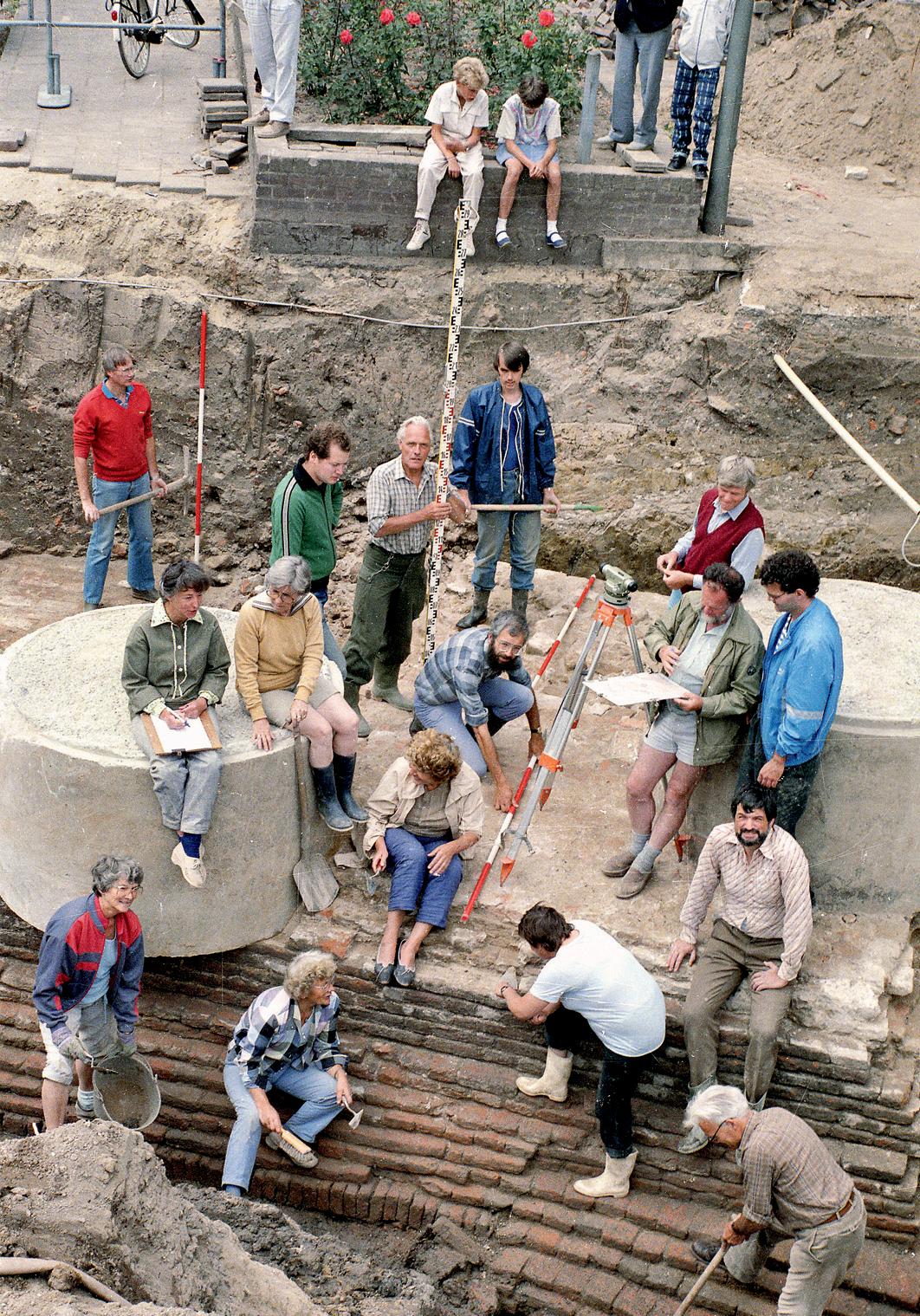 Graafploeg van AWN-afdeling 17 in 1986 op het fundament van de bijna vijf meter dikke weermuur van de middeleeuwse burcht Sevenaer, die door hen is gelokaliseerd. De betonnen funderingsringen zijn van een schoolgebouw, dat deels ‘vaste grond’ vond op de resten van de burcht.