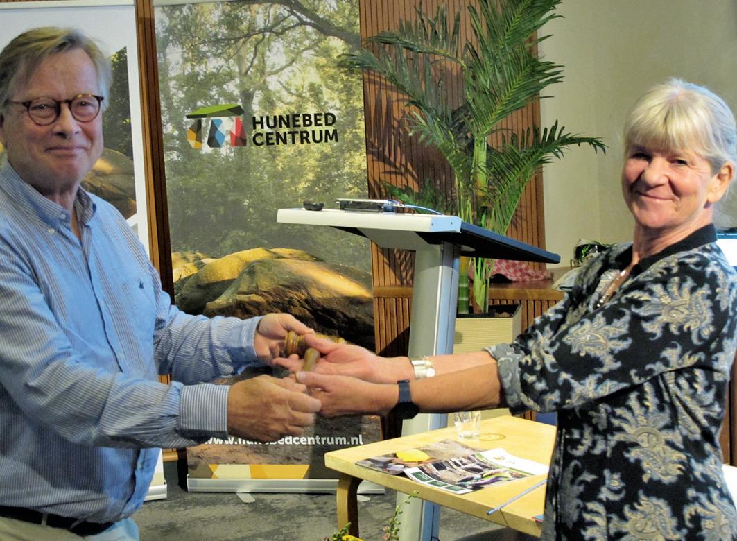 een archeologisch kenniscentrum geworden en een informatiecentrum voor het Drentse landschap. Harrie Wolters herinnerde in zijn toespraakje ook aan een expositie in het Hunebedcentrum in 2009-2010 over ‘Hunebedden in de Oriënt’. De aanleiding voor die expositie was een door Gajus Scheltema geschreven boek over dit onderwerp. Ter herinnering aan deze expositie kreeg Gajus van Harrie Wolters een replica van een aardewerk pot overhandigd.