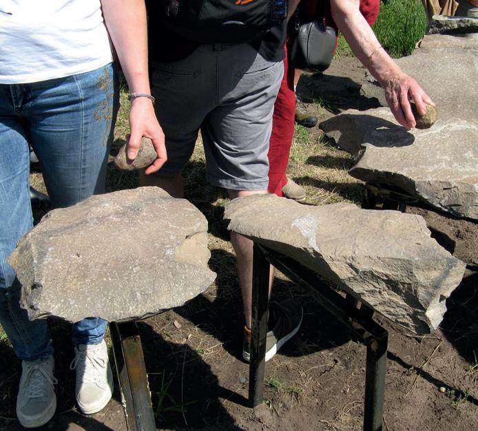 Na de lunch beginnen we met een ‘educatieve opgraving’. Gids Riemke Scharff vertelt dat de hier getoonde huisplattegrond in Borger-Daalkampen is gevonden. Riemke en Fred van den Beemt maken duidelijk dat de bedoeling van dit museumonderdeel en van het hele museum kan worden samengevat in ‘Van ver tot verhaal’. Wat de bezoeker ziet en meemaakt moet iets vertellen over vroeger en dat dichterbij brengen en daarbij weet het Hunebedcentrum zich gesteund door veel vrijwilligers. Deze educatieve opgraving wil de praktijk van het opgraven laten zien en daarom zijn hier en in de tent allerlei zaken te vinden die te maken hebben met archeologisch onderzoek. Ook AWNafdelingen kunnen hier terecht, bijvoorbeeld in het kader van een (beginners)cursus. AWN-afd. 1 - Noord-Nederland en de Werkgroep Deskundigheidheidsbevordering van de AWN kunnen hier een rol in spelen. Desgewenst kan in het kader van een meerdaags arrangement logies worden geregeld.
