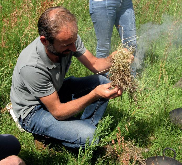 De groep splitst zich en ik sluit aan bij een gids die met een soort wokpannen loopt. Zij is grotendeels gekleed in een bruine leren outfi t met als extra blikvanger een ‘Ötzi-schoudertas’. Karin Olfert is bijna klaar met haar studie Beeldende kunst en Vormgeving en sinds 2½ jaar gids in het museum. We gaan vuur maken met een vuursteenscherf en een ijzeren vuurslag in de vorm van een boksbeugeltje. Volgens onze gids is het tegen elkaar slaan van twee vuurstenen weinig kansrijk. Vuursteen tegen een metaalhoudende steen als pyriet gaat een stuk beter, maar met een ijzeren vuurslag tegen de vuursteen is het vrij eenvoudig. Er is nog wat uitgeplozen tonderzwam nodig, maar Karin gebruikt voor het gemak wat dun katoen dat ze tegen de vuursteen klemt. Na nauwelijks twintig seconden slaan de vlammen al uit het bundeltje gras en dropt ze dat snel in een pan. Enkelen van ons lukt het ook, al duurt het wat langer...