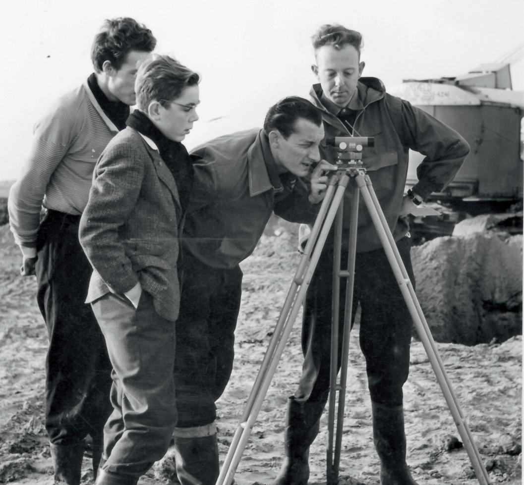 Cees Wind (rechts) geeft les in het waterpassen bij een van de Helinium-opgravingen in de jaren zestig.