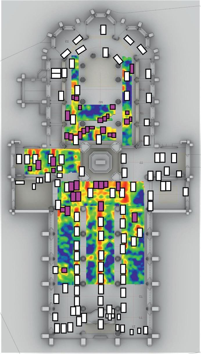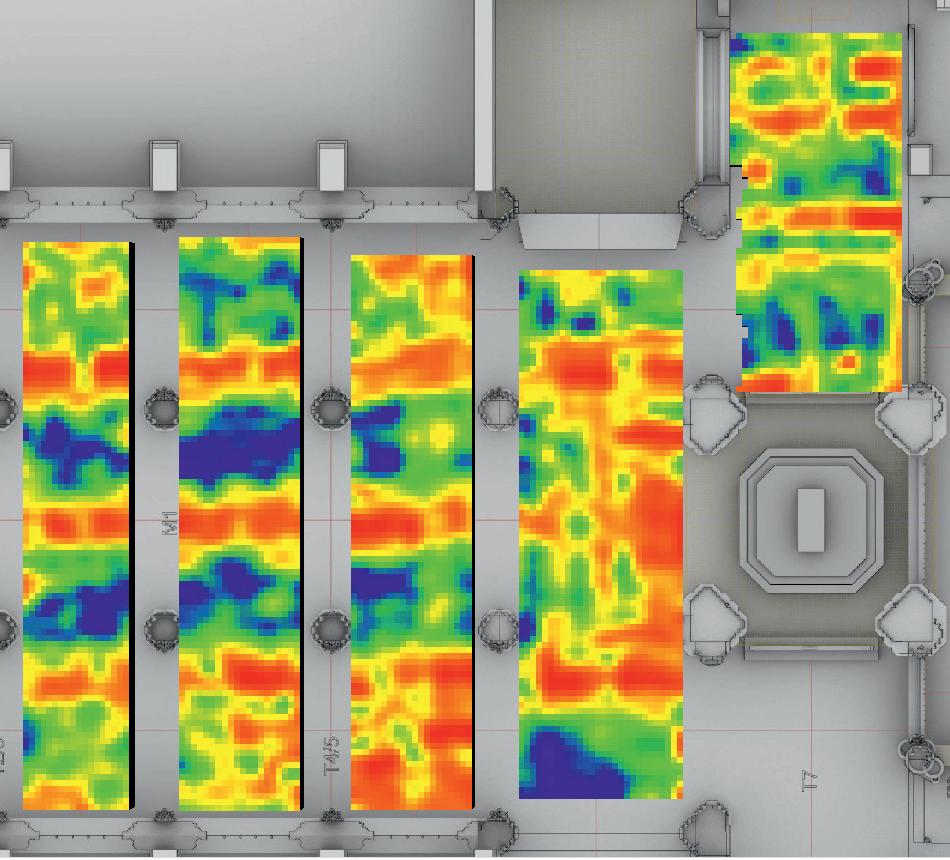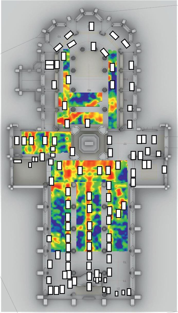 Bodemradarreflecties van een diepte van circa zeventig centimeter, geprojecteerd op de plattegrond van de basiliek met het overzicht van de begravingen. De sterkte van de reflecties wordt weergegeven op een regenboogkleurenschaal. De rode en blauwe kleuren beduiden respectievelijk sterke en zwakke reflecties.