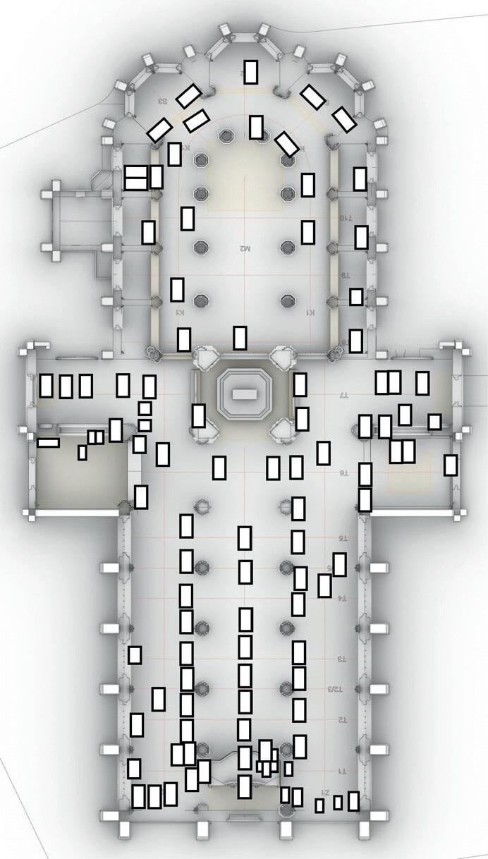 Het meest actuele overzicht van de gedocumenteerde begravingen, geprojecteerd op de huidige plattegrond van de basiliek.