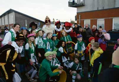 Eerst werd iedereen begroet door de Sint op het podium. Daar werden prijsjes uitgedeeld aan drie kindjes die een prach tige kleurplaat hadden ingele verd. Daarna heeft Sinterklaas een feestelijke rondrit door het dorp gemaakt op zijn trouwe paard, gevolgd door een mooie stoet versierde voertuigen, be geleid door vrolijke muziek.