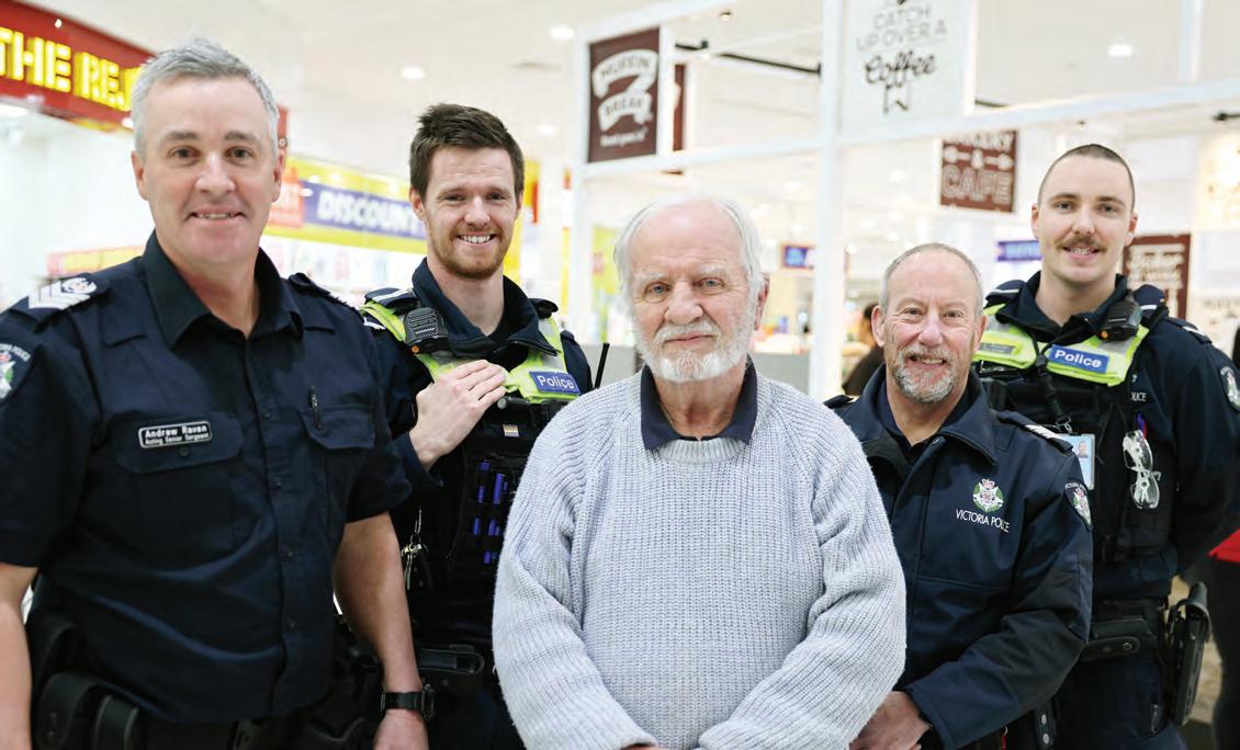 Local shopper Don Stevensons was happy to stop and have a chat with Senior Sergeant Andrew Raven, Senior Constable Christian Bryden, Sergeant Graeme Cox and Constable Lachlan Preston at Gateway Plaza earlier this week. 2024E