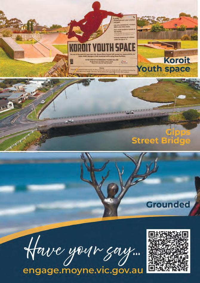 Speaking of listening to people, we want to hear from you with consultations open for a range of initiatives, including the Koroit Youth Space design plan, a proposed Indigenous truth-telling sculpture entitled Grounded and our Gipps Street Bridge replacement project.