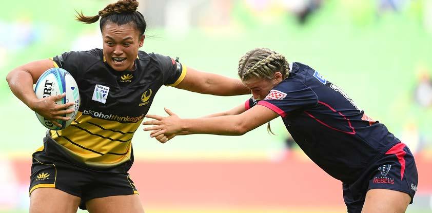 Ariana Hira-Herangi defends a tackle during a RugbyWA Women vs Rebels match, 2019.