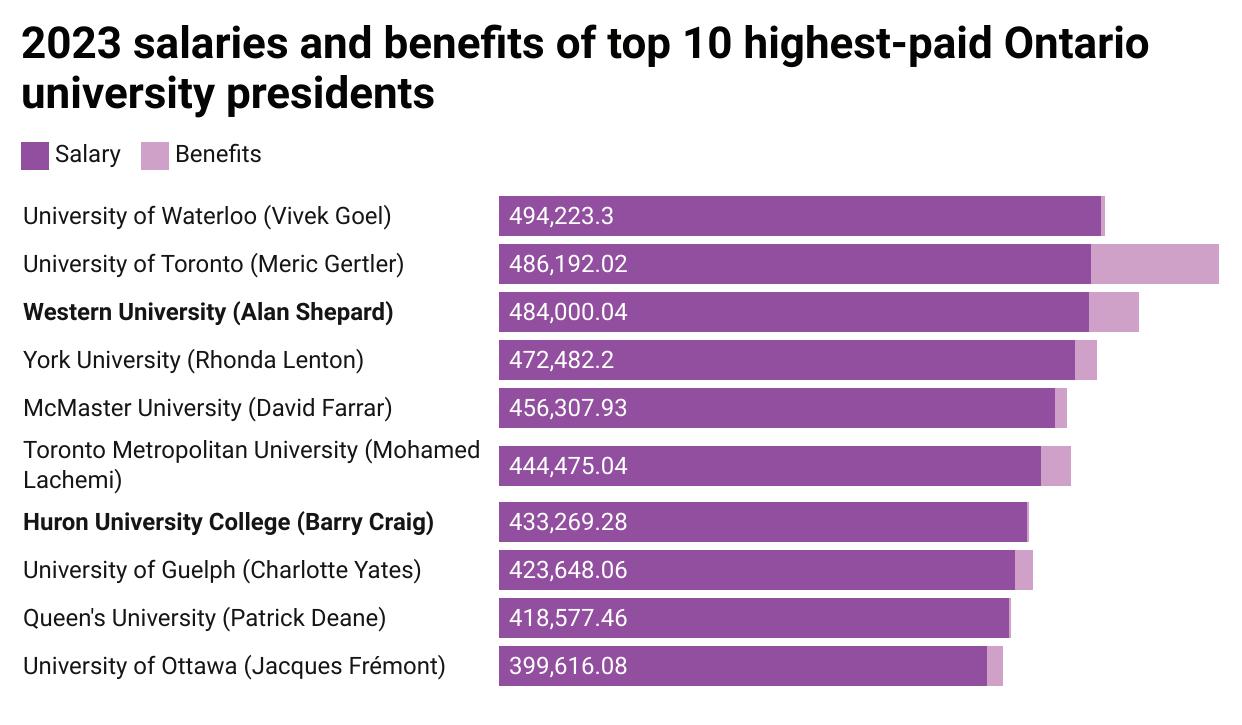 Despite a $4,400 salary increase for Western president Alan Shepard, he is no longer the province’s highest-compensated university president. University of Toronto president Meric Gertler took home $590,615 between his salary and benefits, while Shepard earned a $484,000 salary in addition to $41,275 in taxable benefits in 2023 for a total of $525,275 — bumping him down to second most in the sector.