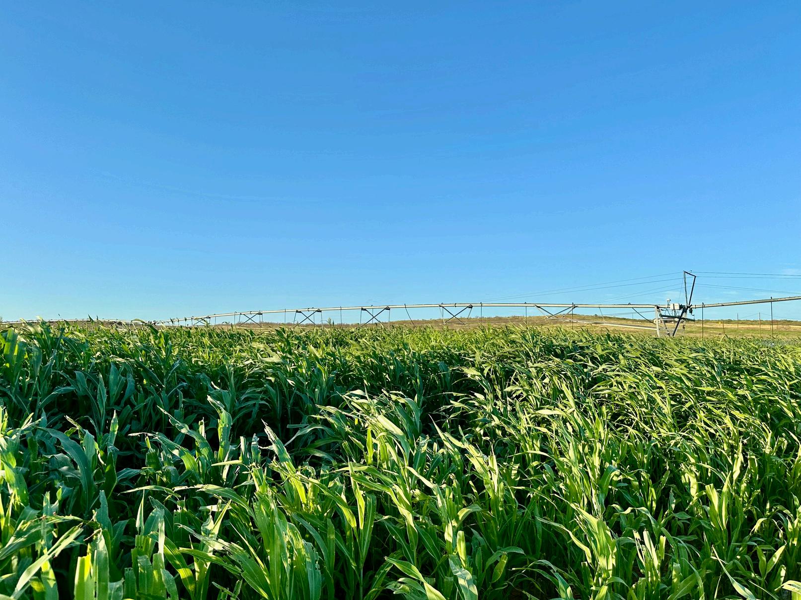 • 9-tower Zimmatic pivot, nozzled for 850 gpm. Two wells feed this system, each producing 600–800 gpm at approximately 110 feet deep.