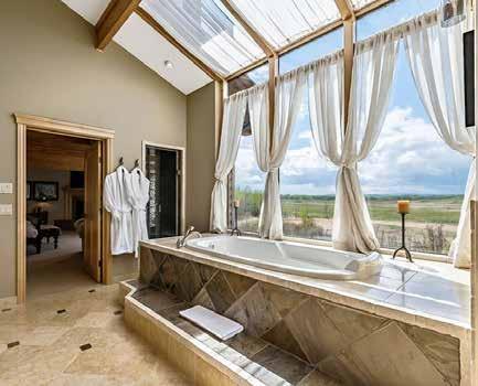 Also on the main floor and tucked off neatly to the side of the dining room is the master bedroom. This room boasts a king bed, sitting area and fire place. Double patio doors look out over the ranch’s tranquil pond, as does the large jet tub of the master ensuite. A tiled shower is visible from the bedroom, via its clear glass block wall design. Inside the primary ensuite is a regal wood vanity that extends up the wall, offering his and her sinks, marble counter tops and a number of drawers for toiletries. Of course, the primary bedroom is also equipped with a large, walk-in California closet for guests who may be travelling with a lot of clothing or planning a fashion shoot at the location.