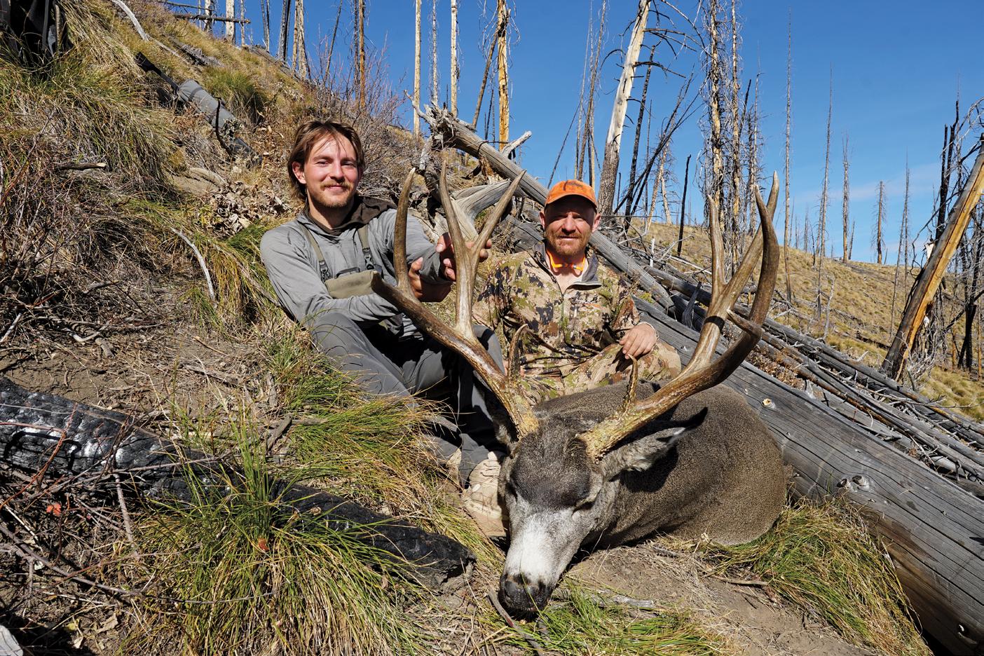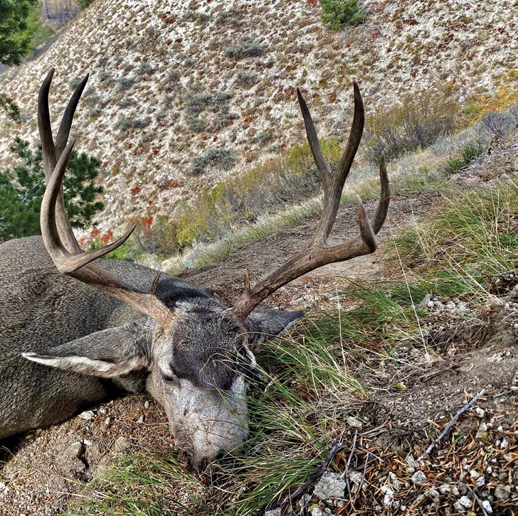 On day two of our hunt, I sent Bodie to check a basin where the previous year I had seen a heavy four-point with great eye guards. Fifteen minutes after first light, I heard a shot. Bodie had ended up finding that same buck. He killed him in almost the same part of the basin where I had seen him. The buck is a stud and goes well over 180 with golden brown antlers and world-class eye guards. We spent the rest of the hunt looking for a big nontypical that I had seen the previous year but couldn’t get killed. At about 10:00 AM on our last day to hunt, I came around the corner of a steep, north-facing ridge and saw a big-framed, mature buck feeding through intermittent burned timber. I thought he looked like a big, wide fourpoint–well past his ears with 18-inch G2s.