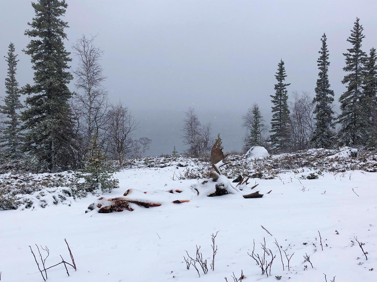 Before the sun came up, we were back in that patch of timber. The first thing I did was find our spent brass, retracing our steps to where we last saw the bull. We walked slow circles in the frozen grass, scanning for blood. Eventually, we found him. Coyotes had already gotten to the bull overnight, leaving ragged marks on the hindquarters.