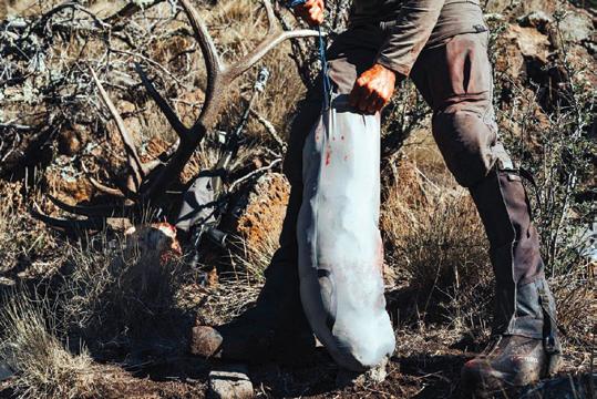 Late that night, we finally made it back down to the river with the first load of meat where we hung the game bags under a tree. We still had a decent hike back to our gear, and we found a place to set up camp and start another fire, which took another 45 minutes. We ate dinner after 1 AM that night and then tucked into our sleeping bags, the only dry piece of kit we still had left. The next day, we had two more grueling trips up the mountain to get the rest of the bull back down to camp.