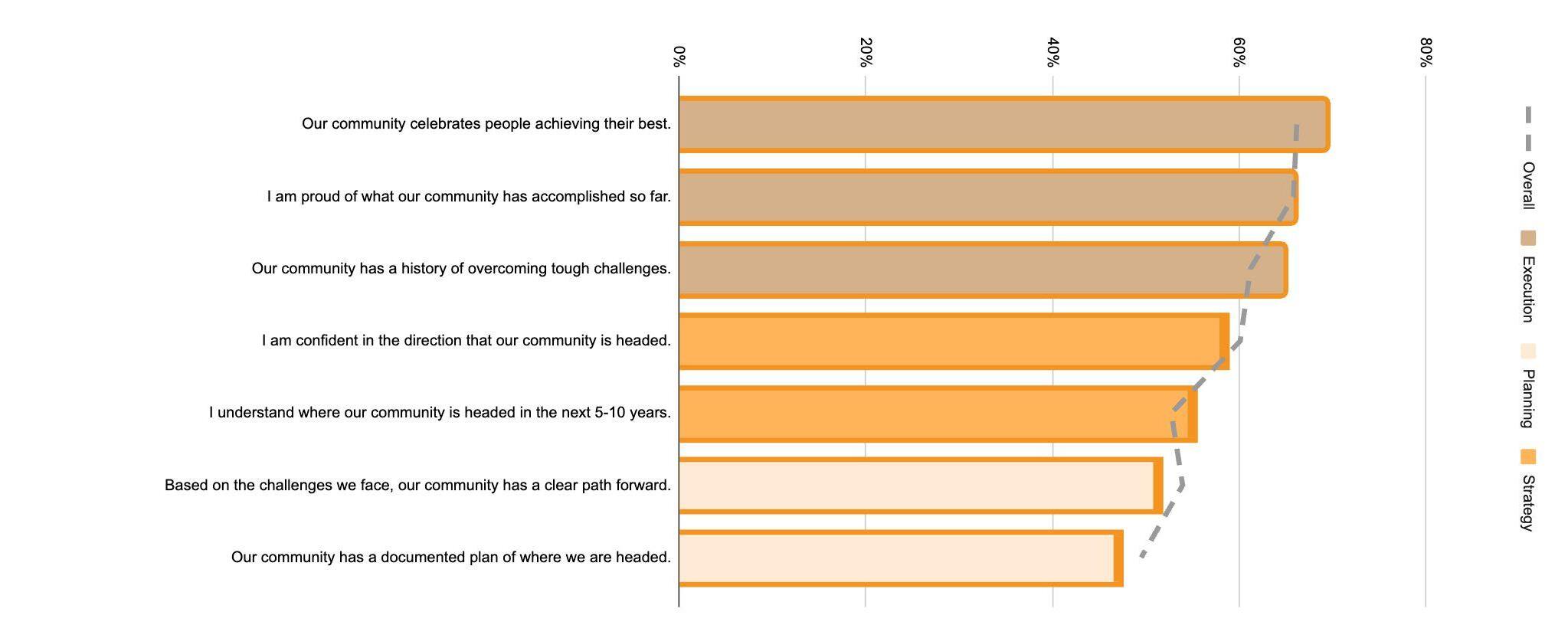 The survey results highlight a strong sense of community among residents, with a particular emphasis on the value of safety and basic needs. While there is confidence in local leadership, especially in terms of economic outlook, residents also express a desire for more social opportunities and enhanced community engagement. Economic conditions are perceived as stable, but there are concerns about future job prospects. Overall, the community is seen as resilient and supportive, with a clear need for continued focus on both economic and social development.
