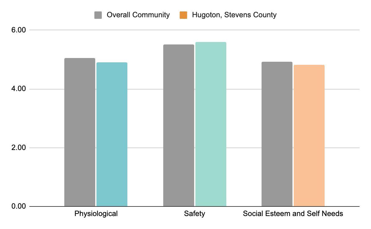 The community's assets are well-regarded for supporting residents' basic needs, safety, and social well-being. For physiological needs, the grocery store, water supply, and Project Hope are frequently mentioned as crucial resources ensuring that residents have access to food, water, and essential services. The presence of these resources reflects the community's commitment to caring for all its members, particularly those facing difficulties. Safety needs are addressed through reliable institutions such as the police and fire departments, as well as the hospital and EMS services. These entities contribute significantly to a sense of personal security and community order. In terms of social, esteem, and self-needs, residents value spaces like churches, schools, and the local movie theater, where they can connect with others and participate in community life. However, there is an expressed need for more opportunities for social interaction and community engagement, indicating room for growth in creating a more vibrant social environment. Overall, the community's assets effectively meet essential needs and provide a foundation of safety, while the enhancement of social and recreational opportunities could further strengthen community ties and individual well-being.