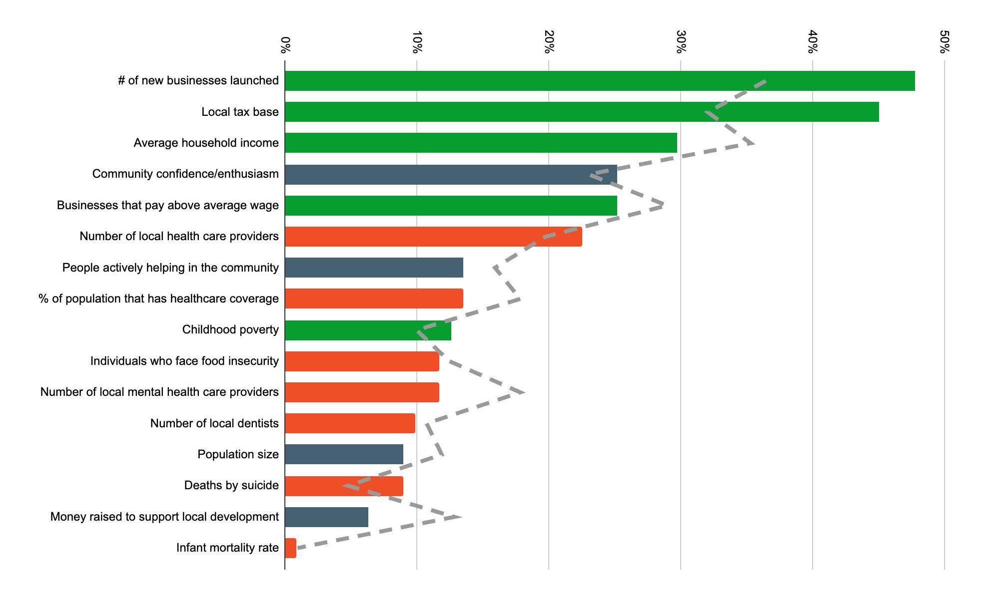 Respondents prioritize economic development, focusing on job creation, business growth, and infrastructure improvements. Community well-being, including health and safety, is also a top priority.