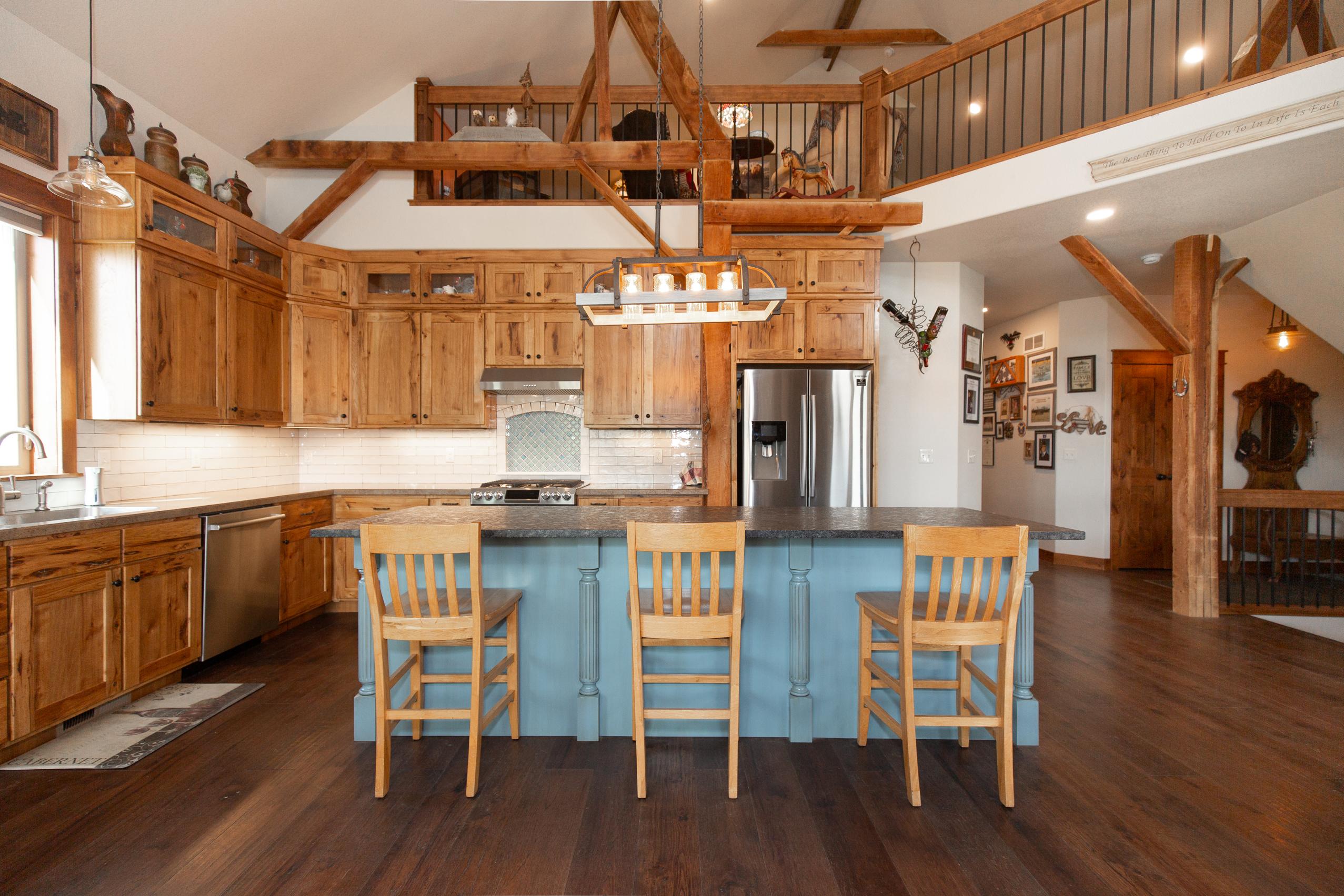 The ranch irrigates just over 300± acres of highly productive creek bottom with 3 center pivots, 5 wheel lines, and additional flood irrigation. The ranch has substantial water rights from Lower Prairie Dog Creek and can easily irrigate 2 cuttings of hay, with potential for a 3rd cutting if an owner desires. In 2023, the ranch produced 1600 tons of grass/alfalfa mix hay over 2 cuttings. The current owner runs a commercial cow/calf operation and rates the ranch at a 250 AU carrying capacity. The ranch would lend itself nicely to a yearling operation or a winter hay base to a larger operation. The balance of the ranch boasts a rich riparian area, rolling native hill country, plus captivating juniper and cottonwood trees. The summer pastureland is watered by a buried pipeline and numerous reservoirs making the entirety of the ranch usable and accessible. Built in 2021, the 4 bedroom, 3.5 bathroom custom home is situated to absorb mountain and pasture views with vaulted ceilings and a desirable open floor plan and rock fireplace. A shop with an apartment above, cattle corrals, and shelters round out the improvements which enables immediate livestock support.