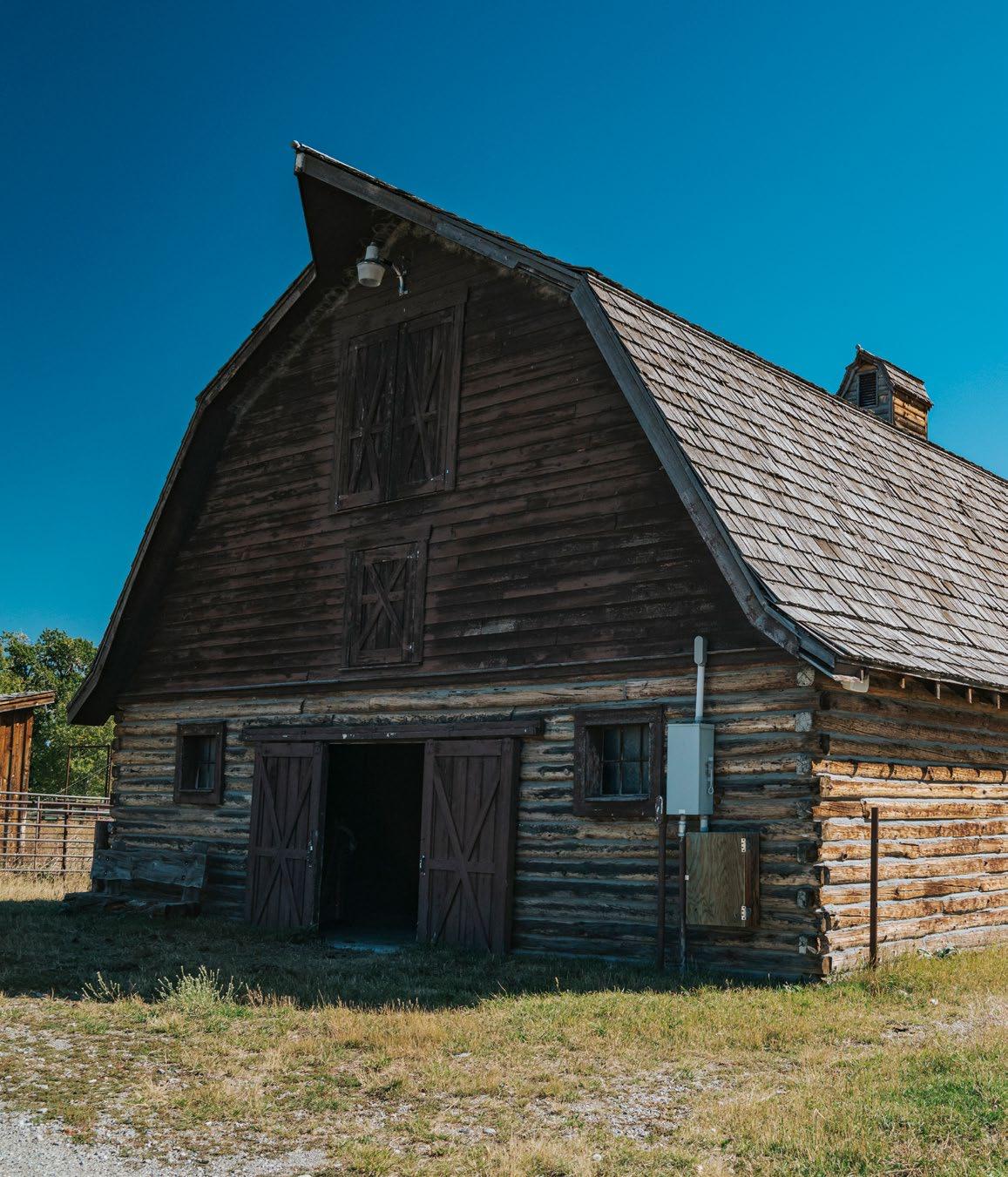A fundamental feature of the FairView Ranch is the historic livestock barn. The traditional loft-style barn measures 36 ft x 78 ft encompassing approximately 2,808± sq ft of indoor space. Oversized logs and the recognizable red paint transport you back in time, while the functionality and practicality of the space provides a space to tack-up and care for livestock. The flooring is concrete, and there is ample lighting throughout the barn plus a tack room and a feed room. Attached to the back side of the historic barn is the notable FairView Ranch sale barn where the operation hosted their own annual registered black Angus bull sales. Measuring 50 ft x 120 ft, this facility is divided into two sections, the front section of which is heated and holds the sale ring complete with the auctioneer stand, three sets of bleachers, an additional office area and two restrooms. The back section of the facility is utilized as a livestock holding area complete with multiple pens and an alleyway. This diverse facility could serve multiple purposes or could continue to be an ideal location for another registered cattle operation.