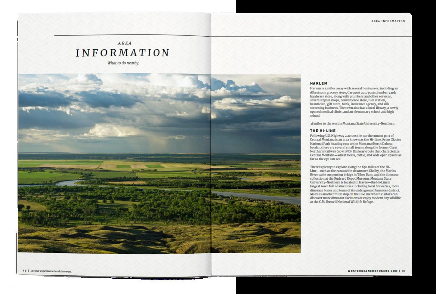 We design a custom brochure for each of our listings, providing potential buyers with a professionally printed copy. Brochures typically include a property overview and have informative sections on the land, improvements, ag operations, water and mineral rights, and any other features that make a property unique.