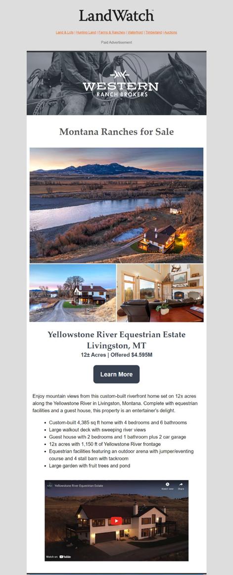 Western Ranch Brokers engages with potential customers with weekly email campaigns to our thousands of newsletter subscribers. Custom designed emails feature eye-catching photography, detailed information about available properties and links to our listings and brochures. We also use our email campaigns to feature areas of interest throughout Montana and highlight the properties which are located nearby, telling a more comprehensive story of the communities and surrounding amenities for those who may be less familiar with the state.