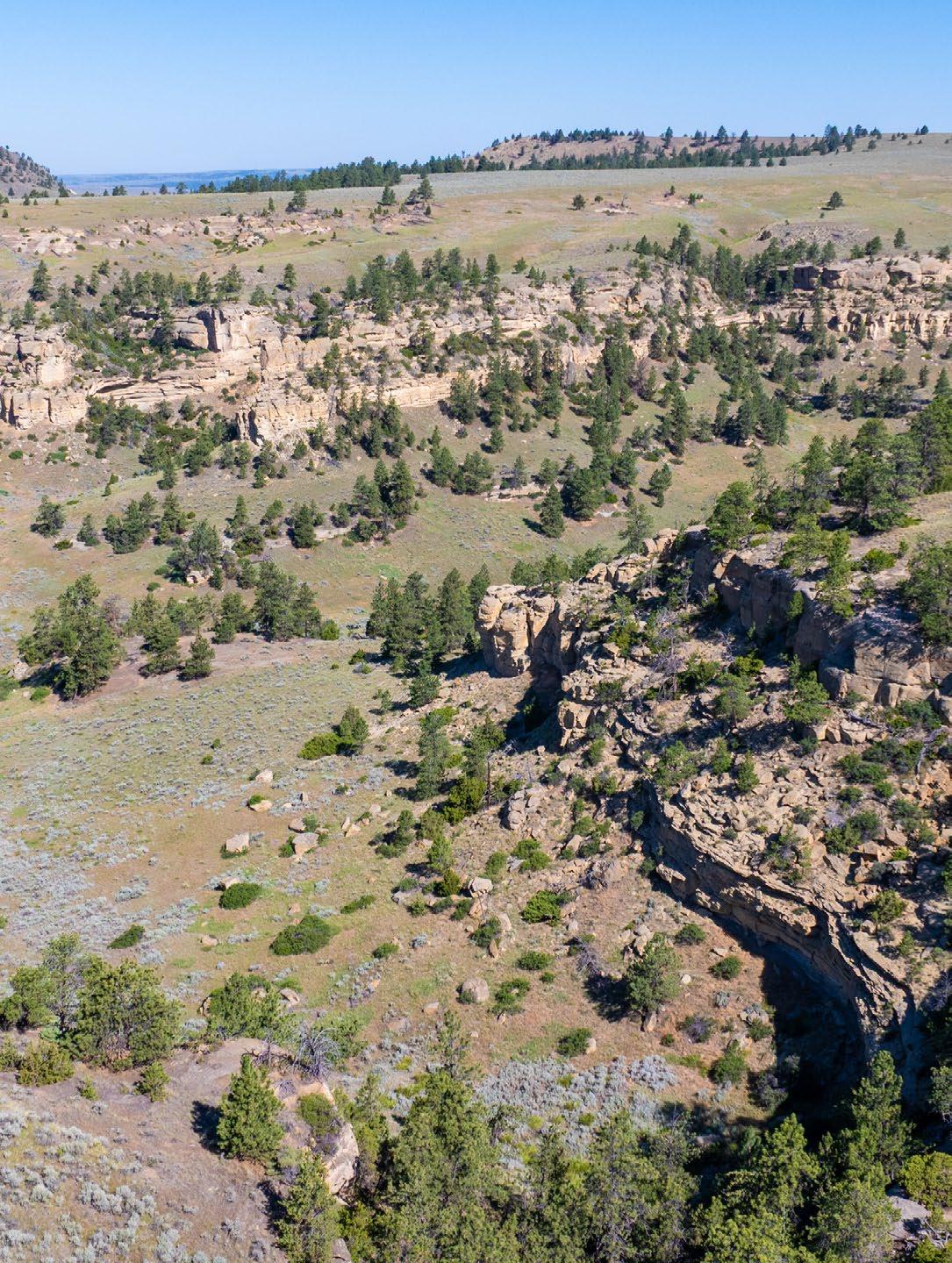 The property’s western boundary is defined by its namesake rimrock formation—a towering wall of stone that not only adds stunning visual character but also serves as a natural windbreak and wildlife corridor. From this elevated ridgeline, panoramic views stretch across the Beartooths, Absarokas, and rolling plains to the north. Seasonal runoff flows through the property’s draws in the spring, providing natural water movement during wetter months.